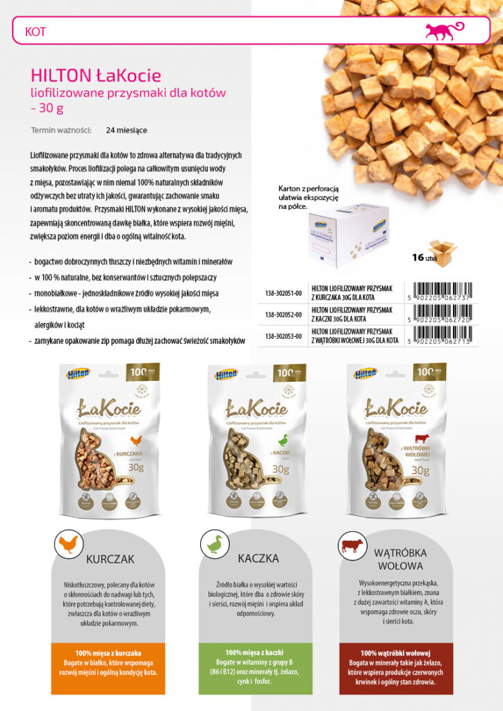 Zadbaj o zdrowie, smak i zadowolenie swojego kota – wybierz liofilizowane przysmaki HILTON w ulubionym smaku: kaczka, kurczak lub wątroba wołowa.