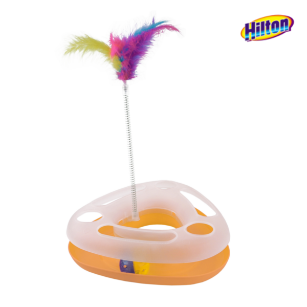 2-in-1 Toy – Colorful feathers are attached to a spring, allowing the cat to enjoy a continuous change in their position. The toy’s base has a hollow tunnel, inside which there’s a ball. The cat plays by moving the ball around.